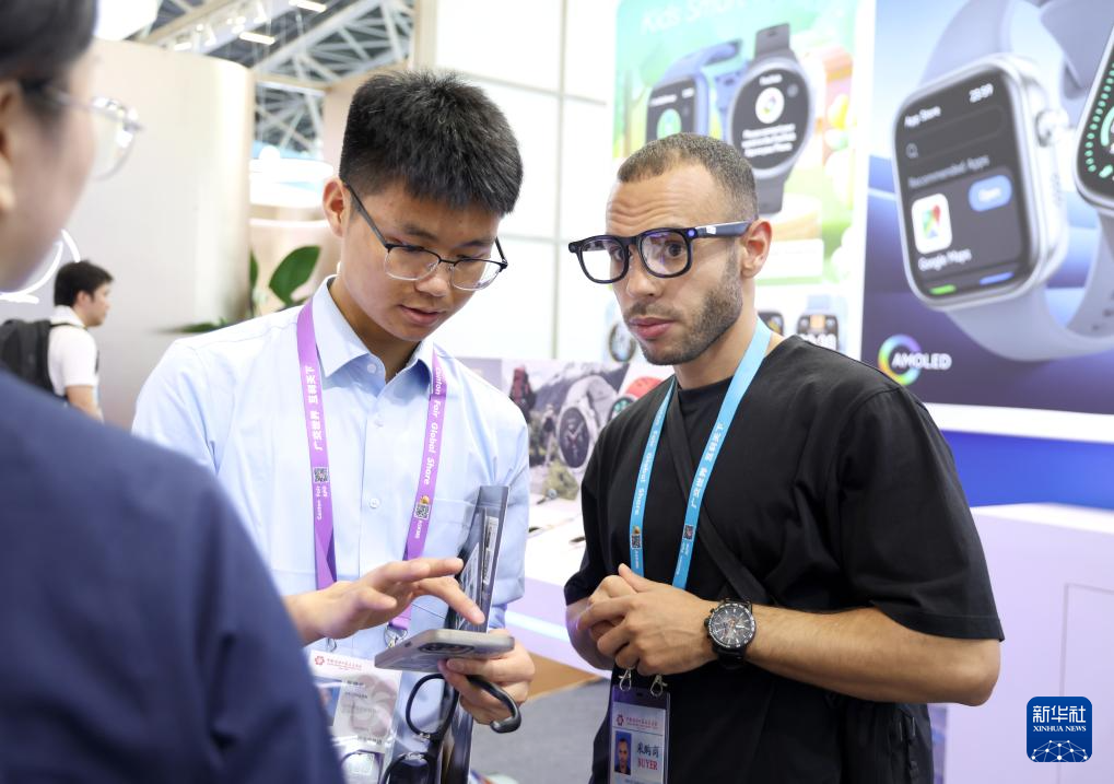 4月15日,境外采购商在广交会智能穿戴展区洽谈。新华社记者 邓华 摄